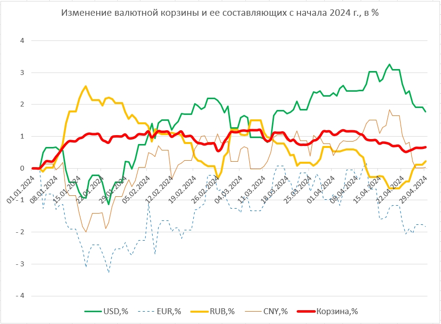 Рост российской валюты в составе корзины «перевесил» снижение доллара и юаня. В результате стоимость корзины после двух недель снижения выросла на 0,08%, что означает соответствующее ослабление национальной валюты.