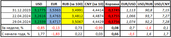 В результате всех этих событий доллар снизился к евро и еще заметнее к российской валюте, но при этом чуть укрепился к юаню. Так, евро после двух недель снижения роста подрос к доллару с 1,0660 до 1,0740 (+0,7%). К российскому рублю, после трех недель роста, доллар снизился с 93,7 до 92,2 (-1,6%). К юаню доллар немного подрос после недели снижения, с 7,27 до 7,28 (+0,1%). При этом доллар подрос не только к юаню. Можно отметить рост доллара к японской иене выше отметки 158, до максимального значения с мая 1990 года.