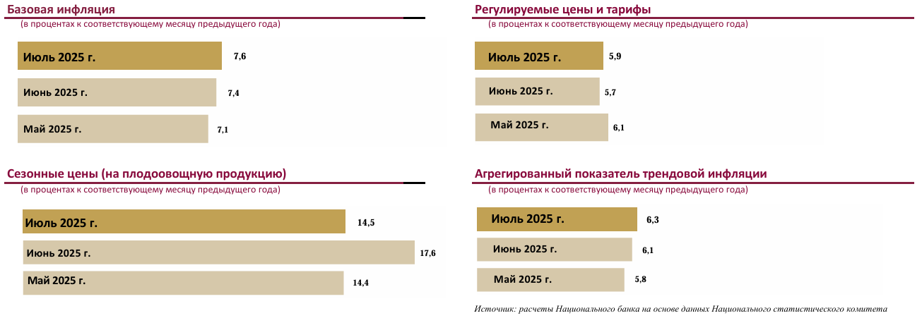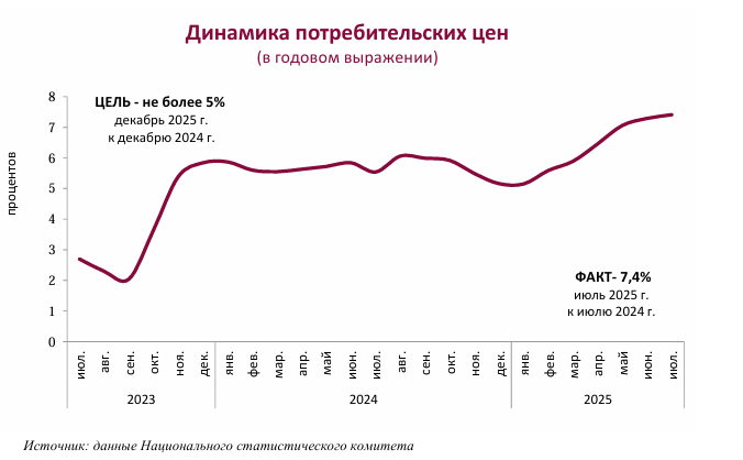 Как всегда, особое внимание мы обращаем на изменение инфляционных показателей, на которые ориентируется Нацбанк при формировании монетарной политики. По состоянию на июль 2025 года индекс потребительских цен (ИПЦ) вырос на 0,2% по сравнению с июнем (м/м), а рост ИПЦ ускорился в годовом исчислении. Годовая инфляция составила в июле 7,4%.