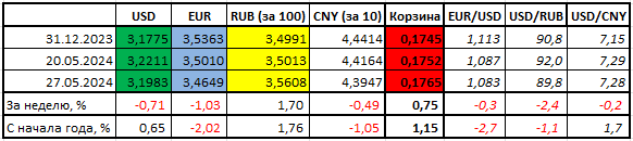 Что касается ожидания рынков по поводу решения по ставке ФРС, которое будет принято на следующем заседании 12 июня, то 99,1% указывает на то, что ставка останется на нынешнем уровне (по сравнению с 91,1% неделей ранее). Оставшиеся 0,9% приходятся на вероятность роста ставки на 0,25 пп до 5,75%. Первое снижение ставки ФРС с наибольшей вероятностью рынок ждет в ноябре, и это будет единственное снижение до конца года. Напомним, что неделей ранее рынок ожидал ближайшее снижение ставки ФРС на сентябрьском заседании и всего два снижения ставки до конца года. Подобное «ужесточение» взглядов на перспективу ставки и помогло доллару слегка укрепиться по отношению к евро.