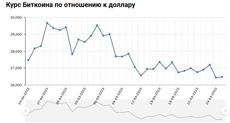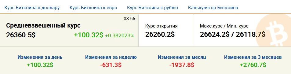 На утро 26 мая, по данным с сайта Myfin.by, средневзвешенный курс биткоина составил $26360,5 (на 8:56 по Минску).