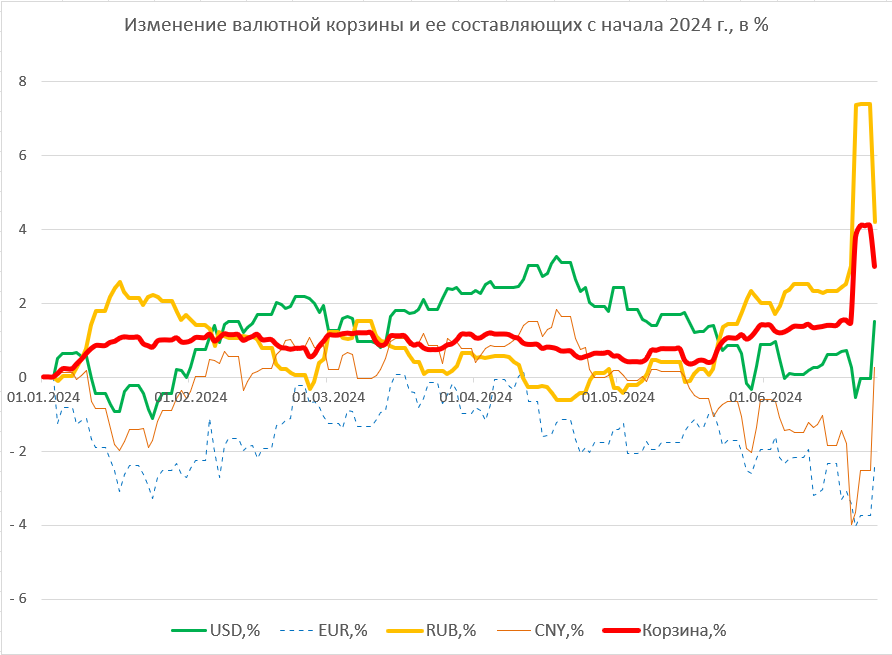 Рост всех валют, входящих в корзину, естественным образом заставил подрасти и ее саму. В результате корзина подорожала пятую неделю подряд, на этот раз на 1,45%, что означает соответствующее ослабление национальной валюты. Отметим, что стоимость корзины при этом третью неделю подряд обновляет максимум с начала года. Кроме того, корзина показала самый серьезный недельный рост с декабря 2022 года.