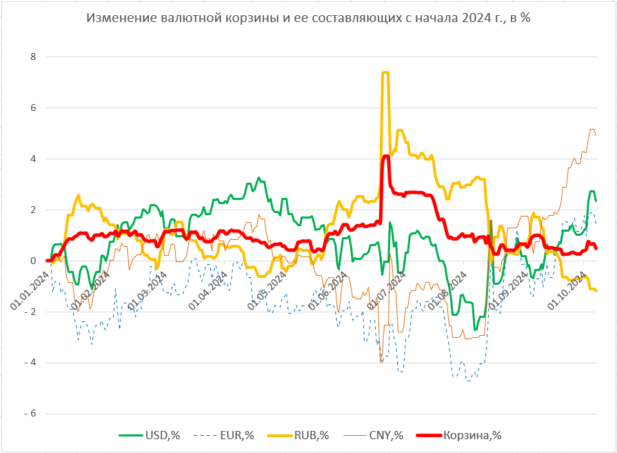 На этот раз рост доллара и юаня в составе корзины «перевесил» снижение российского рубля. В результате корзина подорожала вторую неделю подряд, на 0,11 %, что означает соответствующее ослабление национальной валюты.