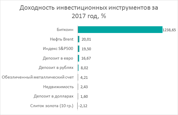 – Самым доходным инструментом в 2017 году предсказуемо стали криптовалюты. В частности, биткоин, который включен в общий рейтинг как самая первая и известная криптовалюта, за год принес инвесторам более 1200%. И это не предел: некоторые другие криптовалюты продемонстрировали еще более быстрый рост. Например, Ethereum за год подорожал на 9400%, Ripple – на 33600%.