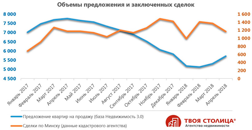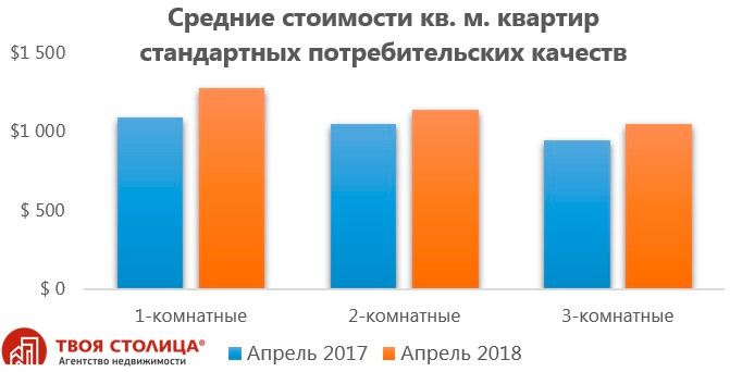 Что касается квартир вторичного рынка, то за январь-апрель текущего года квартиры стандартных потребительских качеств подорожали в среднем на 9% или порядка +100 USD на 1 квадратный метр. То есть за текущую стоимость квартиры, в конце 2017 г. можно было не только купить квартиру, но еще и сделать в ней косметический ремонт. А если сравнить текущий уровень цен с аналогичным периодом прошлого года, то дельта вырастает до 13% или порядка +130 USD/кв. м.