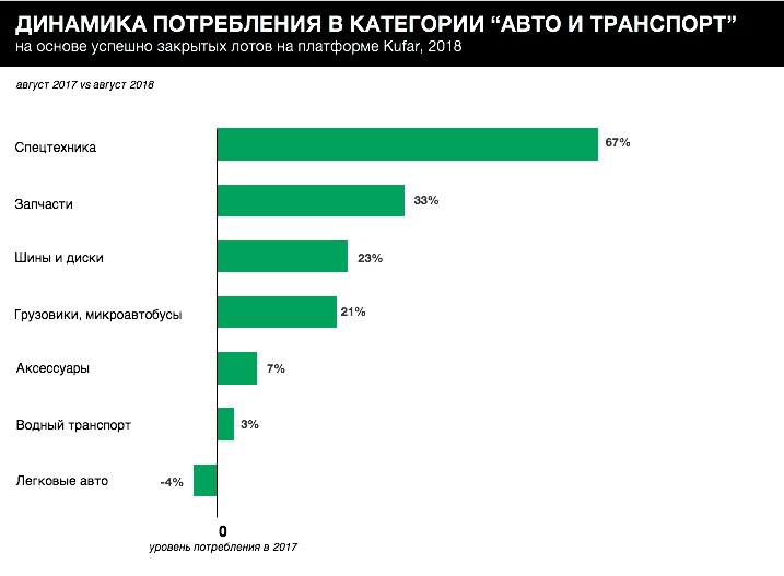 Интересно, что по сравнению с июлем 2017, доля сделок с шинами и дисками существенно увеличилась (+23% к потреблению). Это может быть связано с желанием сэкономить, ведь летом цены на зимнюю резину гораздо привлекательнее, чем в сезон. Сегменты водного транспорта и спецтехники в августе также выросли: +3% и +67% к доле покупок соответственно.