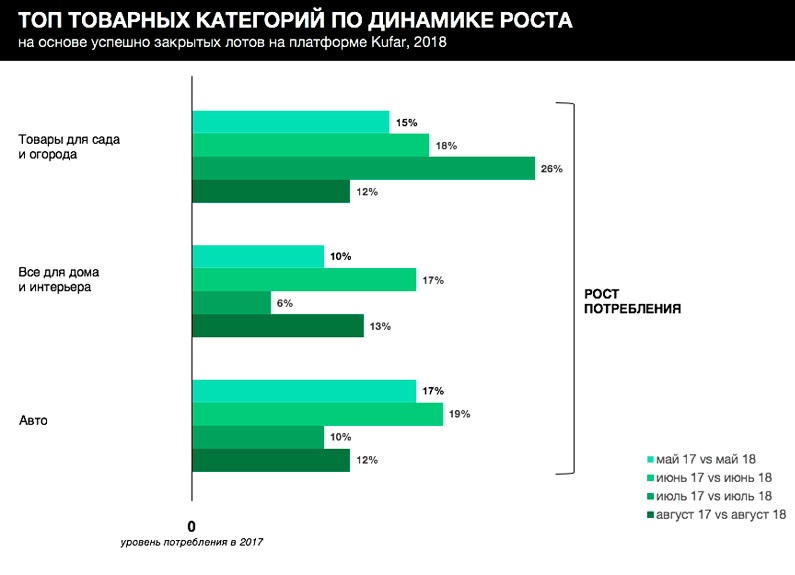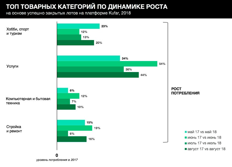 Этим летом активнее всего росло потребление в трех категориях: услуги, товары для спорта и туризма, товары для сада и огорода. Так, в июне 2018 белорусы заказывали услуги по объявлениям на 54% чаще, чем в июне прошлого года, на 12% чаще покупали товары в категории «Хобби, спорт и туризм» и на 18% — товары для дачных участков. Увеличилась доля сделок в сегменте транспорта, стройки и ремонта, техники, товаров для дома и интерьера. В августе тенденция к росту продолжилась: +20% к приобретению товаров для спорта и туризма, +44% к услугам, +12% к товарам для сада и огорода.