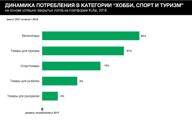 По объемам продаж и по динамике роста велосипеды по-прежнему на первом месте. Также летом 2018 росла популярность таких туристических товаров, как палатки, рюкзаки, спальники, походные плиты. В августе 2018 покупали на 21% чаще, чем в аналогичном месяце прошлого года. Товары для спорта белорусы приобретали на 15% чаще, чем прошлым летом, а для рыбалки — на 9%. Доля покупок велосипедов в августе этого года была на 17% выше, чем в августе прошлого года, а товаров для рукоделия — на 4%.