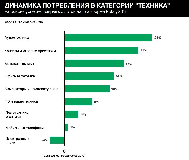 Больше всего сделок в августе было совершено с мобильными телефонами, бытовой техникой, компьютерами и комплектующими. По динамике потребления (изменение в доле заказов в 2018 году по сравнению с 2017 годом) в лидеры вышли аудиотехника (+25%), консоли и игровые приставки (+21%), бытовая техника (+17%). Электронные книги оказались среди товаров, которые теряют популярность (-4% к доле сделок).