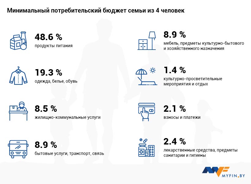 Удельный вес основных статей потребительских расходов в минимальном потребительском бюджете семьи из четырех человек в ценах сентября 2018 г. рассчитан так: продукты питания – 48,6%, одежда, белье, обувь – 19,3%, жилищно-коммунальные услуги – 8,5%, бытовые услуги, транспорт, связь – 8,9%; мебель, предметы культурно-бытового и хозяйственного назначения – 8,9%, культурно-просветительные мероприятия и отдых – 1,4%, взносы и платежи – 2,1%, лекарственные средства, предметы санитарии и гигиены – 2,4%.