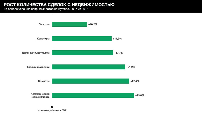 О том, что белорусы стали покупать больше дорогих товаров, свидетельствуют также данные сервиса Куфар Недвижимость. В количественном выражении в 2018 году по всей Беларуси было приобретено на 17,3% больше квартир, чем в 2017 и на 17,7% больше дачных домов и коттеджей. На 10,2% выросло количество сделок с участками, на 21,2% — с гаражами и на 22,4% с комнатами и долями квартир. Количество сделок с коммерческой недвижимостью в 2018 было на 23,8% больше, чем в 2017.