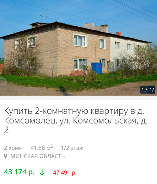 За 47 276 белорусских рублей, или $21 900, на сайте domovita.by предлагается 2-комнатная квартира в аг. Михановичи.