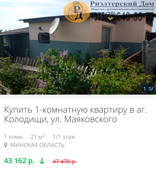 За 43 162 белорусских рублей, или $20 000, на сайте domovita.by продается 1-комнатная квартира, расположенная в аг. Колодищи по ул. Маяковского.