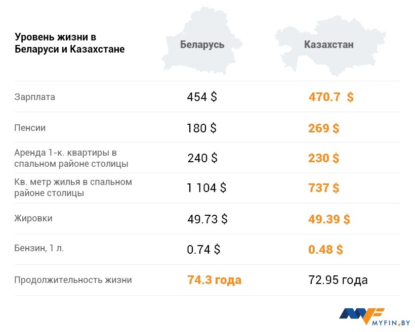 Зарплаты в Беларуси и Казахстане практически одинаковые – мы уступаем чуть более $15, а вот пенсии у казахстанцев на порядок выше. По ценовым показателям у нас выгоднее покупать некоторые категории продуктов. А вот хлеб, рис, яйца, сыр в Казахстане гораздо дешевле. То же касается и жилья – если цены на аренду относительно сопоставимы, то цены на покупку жилья существенно отличаются: в Астане квартиры не такие дорогие.
