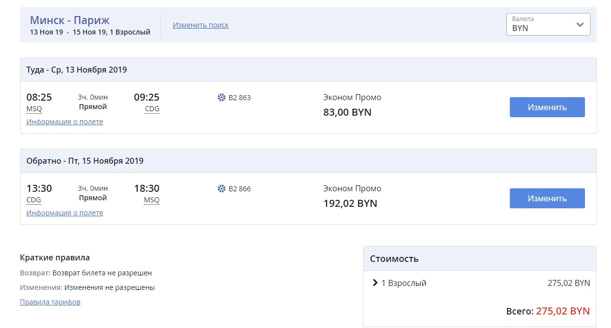 Мы проверили несколько популярных маршрутов. Так, из Минска в Москву можно будет долететь за 60,09 BYN, в Прагу – за 89,48 BYN, в Вильнюс – за 55,81 BYN, в Варшаву – за 78,17 BYN, а в Париж – за 94 BYN. Проблемы могут появиться при подборе обратного билета, так как близкие даты раскупаются очень быстро, а лететь домой по полной стоимости может выйти довольно накладно. К примеру, стоимость билетов туда и обратно в Париж на два дня обойдется уже в 275,02 BYN даже по сниженным ценам.
