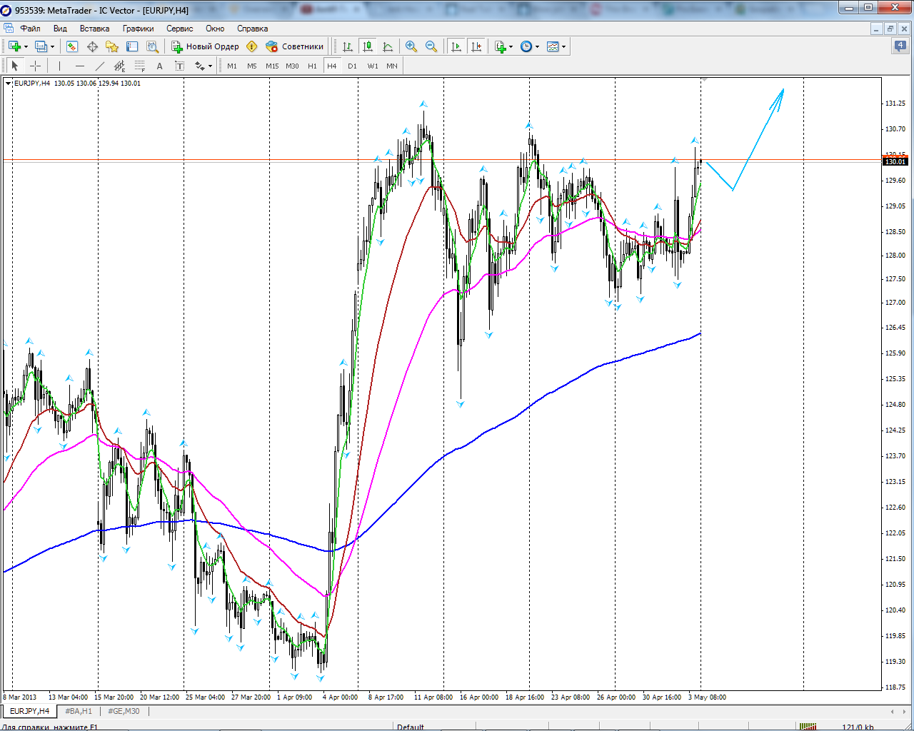 В пятницу 03.05 вышли хорошие данные о безработице в США, в результате чего доллар подорожал ко всем валютам. Эта тенденция, скорее всего, сохранится в течение ближайшей недели, и если пара EUR/USDбудет торговаться выше отметки 1.3100, то мы вправе рассчитывать на рост EUR/JPY.