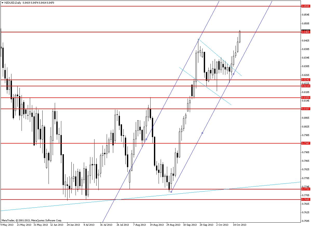 После долгого периода затишья пара NZDUSD пробила максимальные значения и продолжила активный рост. В данный момент цена пытается пробить уровень 0.8465, после чего, если цена закроется выше данного уровня, она устремиться к уровню 0.8585.