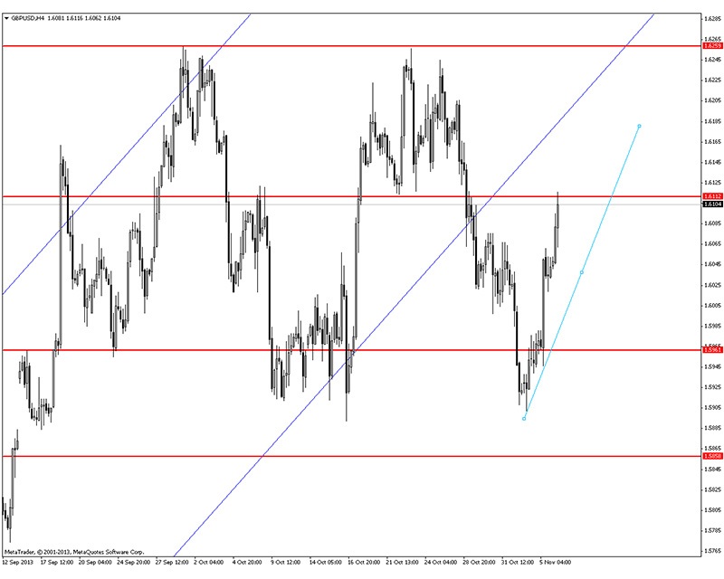 Пара продолжает движение в области бокового тренда, цена приблизилась к опасному уровню 1.6112, после чего ждем коррекцию от него же. Когда завершится коррекция, пара будет продолжать движение по основному тренду к уровню 1.6259.