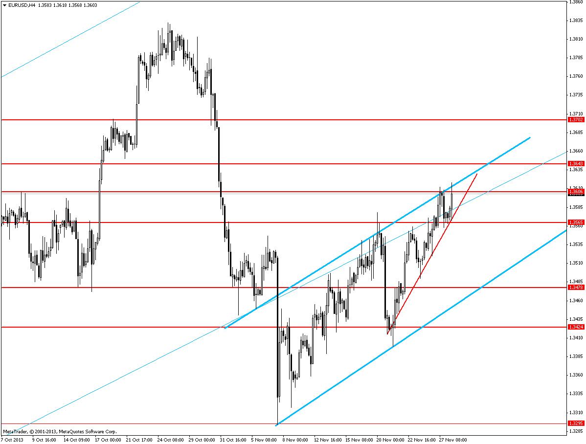 Пара EURUSD демонстрировала растущее движение, в данный момент цена достигла уровня 1.3606 и пытается пробить его. С точки зрения долгосрочного движения цена достигла максимума и начнет корректироваться к линии тренда. Ближайший уровень поддержки, на который следует обратить внимание это 1.3565, следующий после него 1.3478. Покупаем только после пробоя уровня 1.3643.