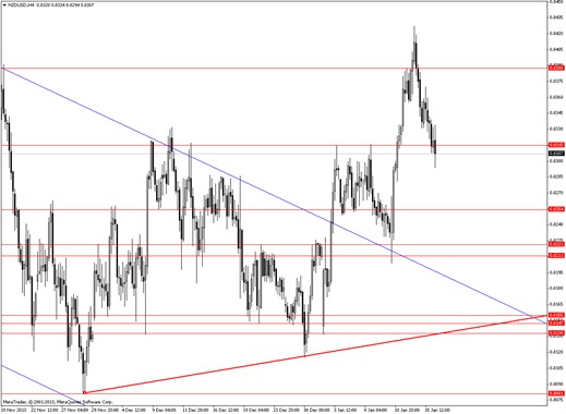 На этой неделе пара NZDUSD тоже демонстрирует спад после разворота на уровне 0.8426, несмотря на активный рост на предыдущей неделе. Цена пробила уровень поддержки 0.8315, после чего пытается вернуться. Наверняка, цена продолжит падение к уровням 0.8254, 0.8221, 0.8211.