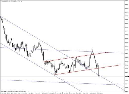 После довольно длительного движения в слабо растущем канале пара начала стремительное падение от максимумов и продемонстрировала пробой минимального значения канала. В данный момент цена продолжает снижение, приближаясь к явным минимальным значениям за последние несколько лет. Поэтому долгосрочные продажи не стоит держать. А покупать следует, только если цена пробьет уровень 0.9100.