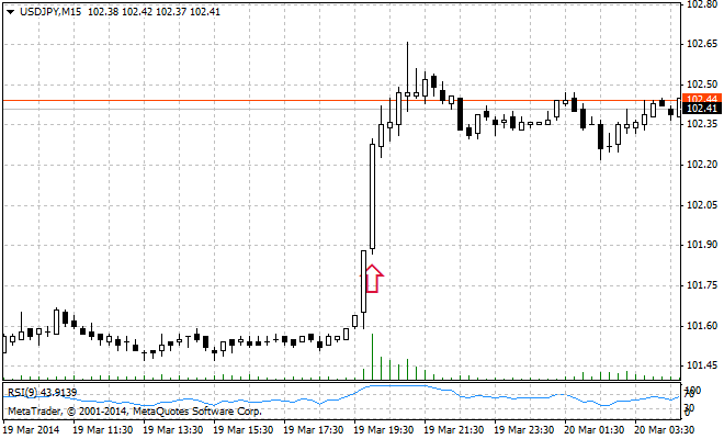 · Заявление FOMCпо ставке и QE3, выступление Джанет Йеллен (19.03) – укрепление USD, рост USD/JPYна 60 пунктов за 1 час;