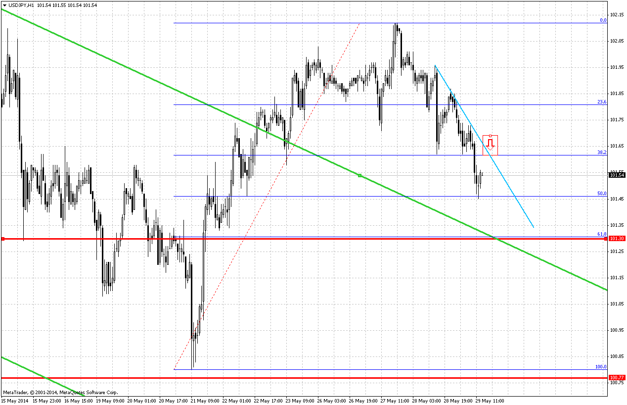 Пара USDJPY в данный момент демонстрирует небольшую коррекцию. После формирования нового уровня сопротивления ждем продолжения снижения цены к уровням 101.30 и 100.77.