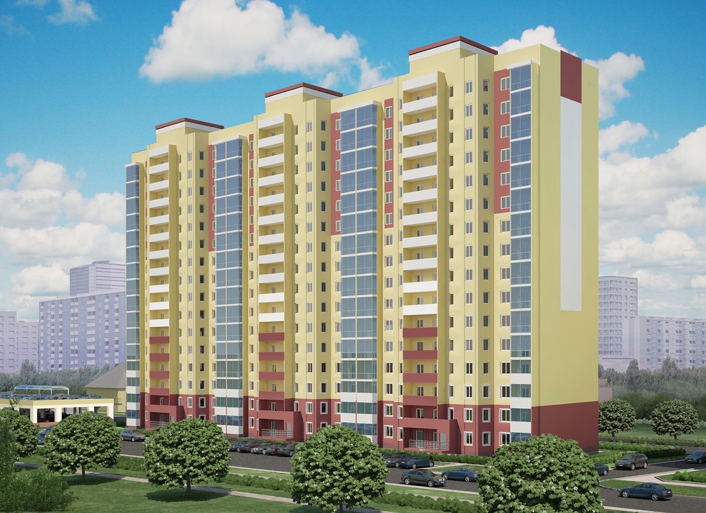 Два нижних этажа – торгово-административные помещения. Наземно-подземный паркинг на 300 машино-мест. Вокруг дома ухоженная зеленая зона, во дворе – детская площадка.