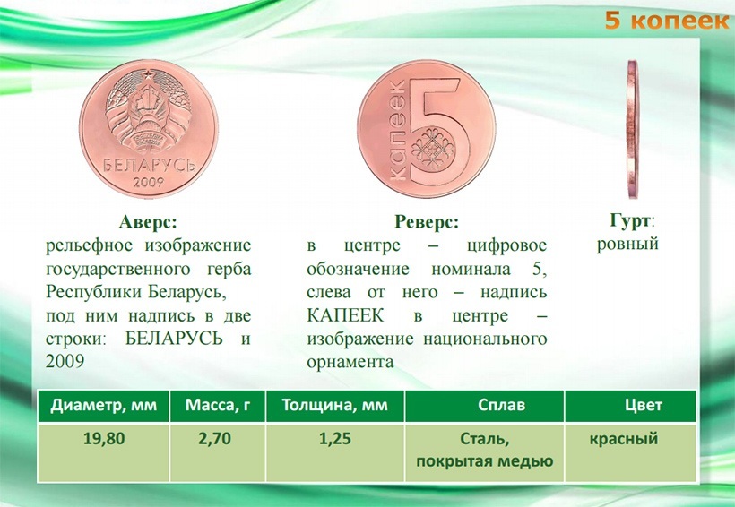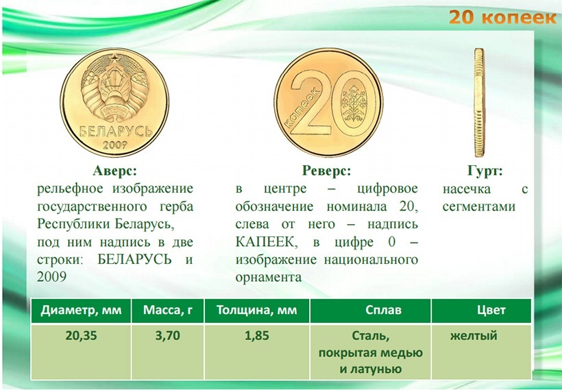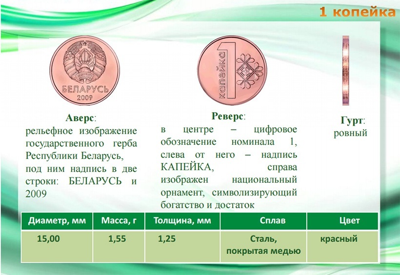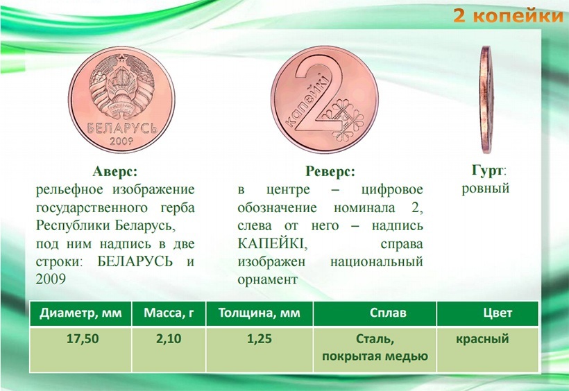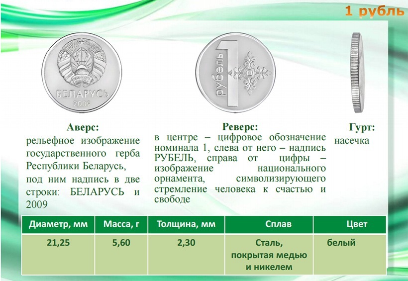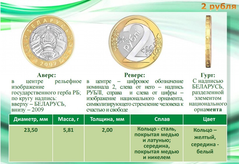 Ребро у 1, 2 и 5 копеек – ровное, 10, 20 и 50 копеек – с насечкой с сегментами, 1 рубль – сплошная насечка, 2 рубля – с надписью Беларусь и элементами национального орнамента.