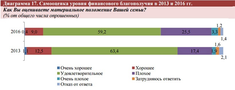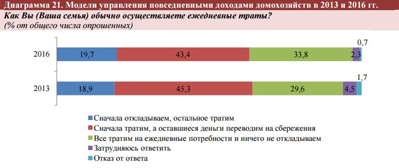 Доля респондентов, которые тратят все средства на текущие нужды и ничего не откладывают, составила почти 34%. Из них 82,2% причиной назвали невысокий уровень дохода. По сравнению с 2013 годом этот показатель вырос почти на 17 процентных пунктов.