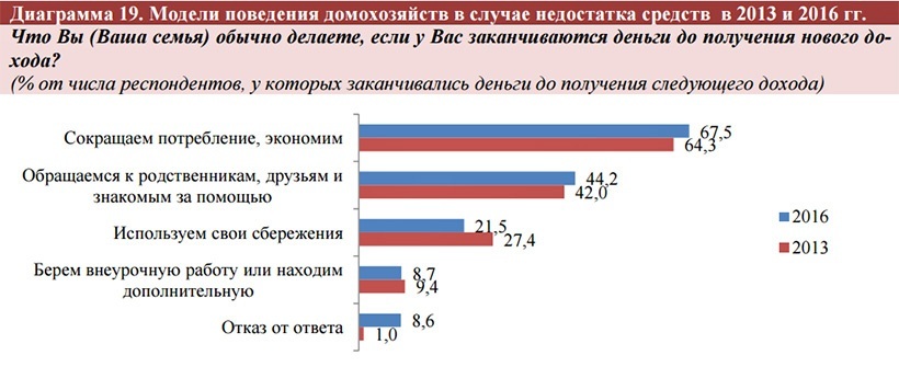 Большинство опрошенных для решения своих финансовых трудностей прибегает к сокращению потребления и экономии (почти 2/3 из тех, кто сталкивался с проблемой нехватки средств). Распространено также обращение за помощью к родственникам, друзьям и знакомым (примерно 44%).