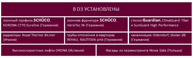 D3 стал для Минска знаковым проектом. Мы не просто анонсировали новый стандарт городской квартиры, но и поддержали это в каждом элементе проекта. В квартирах D3устанавливается оборудование только ведущих европейских производителей, часть из которого впервые было выбрано для установки на масштабных жилых объектах в Минске. Мы тщательно выбираем каждый элемент по техническим, эксплуатационным и эстетическим характеристикам.