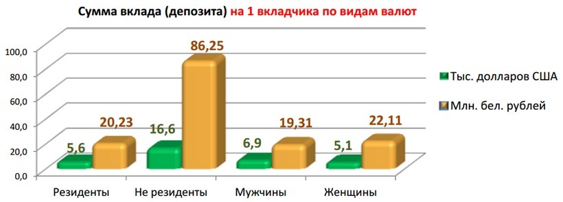 В среднем один вкладчик-резидент разместил в национальной валюте 20,2 млн рублей, в иностранной – 5,6 тыс. долларов США. Нерезидент имеет 86,3 млн рублей и 16,6 тыс. долларов соответственно.