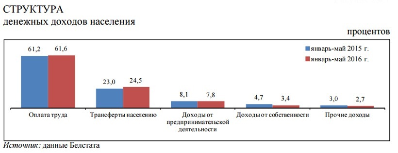 В январе-мае 2016-го в общем объеме денежных доходов населения доля оплаты труда и трансфертов, т. е. пенсий, пособий и стипендий, составила 86,1 процента. За тот же период 2015-го она равнялась 84,2 процента.