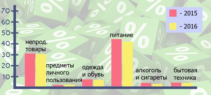 В частности, на питание у нас тогда уходило 43,3 процента от всех трат, теперь же стало 42. Радует хотя бы то, что меньше стали захаживать в отделы спиртных напитков и табачных изделий – здесь падение с 3,7 до 3,4.