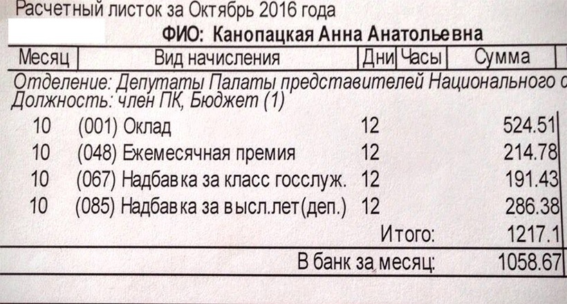Депутат нижней палаты парламента Анна Канопацкая выложила на персональной страничке в Facebook фото своего расчетного листка за октябрь.