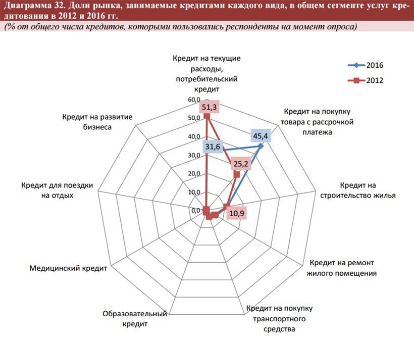 Итого если в 2012-м доля потребительских кредитов была равна 51,3 процента, то в 2016-м она снизилась до 31,6. А доля тех, которые берутся на покупку с рассрочкой, выросла с 25,2 процентов до 45,4, выйдя на первое место.