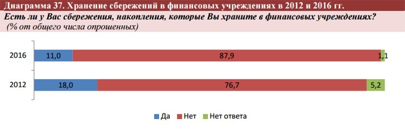 Депозиты в банках открыты сейчас только у 11 процентов белорусов. Четыре года назад их было значительно больше – 18 процентов. А вот число тех, кто пользуется кредитами, почти не изменилось. И в 2016-м, и в 2012-м таких людей насчитывалось 24 процента.