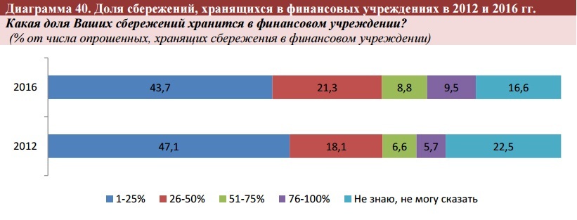 Почти половина респондентов, имеющих сбережения в финучреждениях, хранит на сберегательных счетах менее четверти всех своих накоплений, еще каждый четвертый – 25-50 процентов.