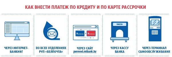 Кроме размеров платежей, ставок и сроков важную роль при выборе кредита играет удобство погашения задолженности. Узнайте заранее, делает ли банк смс-рассылку с напоминанием внести ежемесячный платеж и указанием его размера, можете ли вы совершить платеж удобным для вас способом, а не только через кассу банка в определенные часы. Например, если в вашем населенном пункте нет отделения МТБанка, это не значит, что придется ехать другой город.