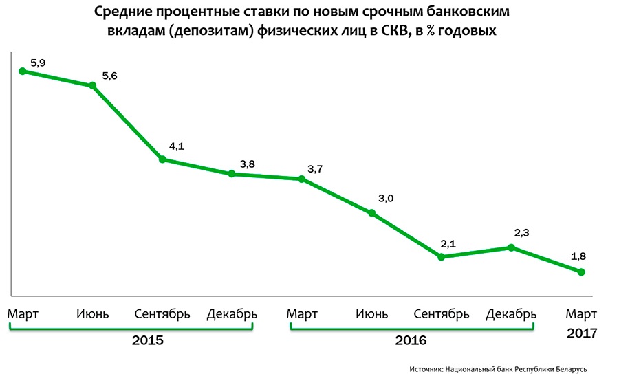 За последние 2 года средняя ставка по валютным депозитам физических лиц упала в 3 раза: с 5,9% годовых до 1,8% годовых.