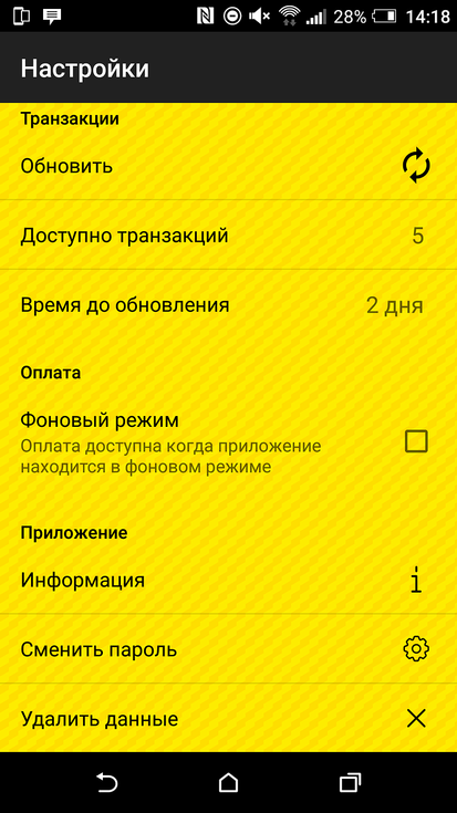 В настройках в разделе «Транзакции» три пункта: «Обновить», «Доступно транзакций» и «Время до обновления». Что это такое? Суть в том, что по причинам безопасности смартфон время от времени «связывается» с банком. Происходит это либо после каждых пяти совершенных с его помощью транзакций, либо каждые два дня. Сейчас напротив «Доступно транзакций» мы видим цифру «5»: никаких оплат с помощью телефона еще не совершалось. Кнопкой «Обновить» можно принудительно заставить телефон связаться с банком.