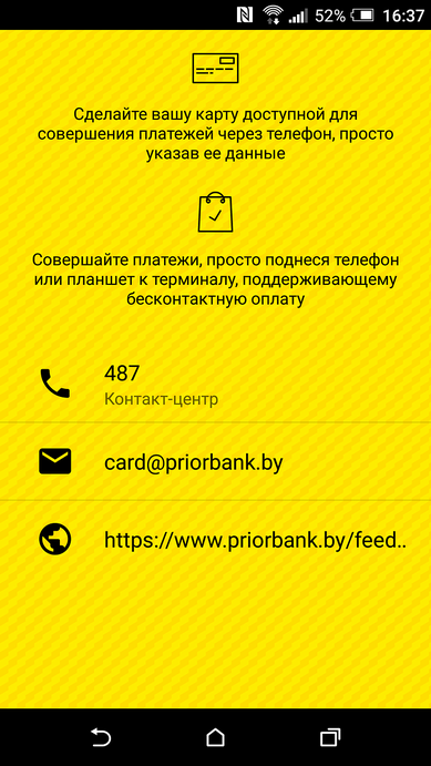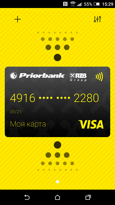 Итак, мобильный интернет включен, приложение Prior Pay запущено, модуль NFC активирован. На желтом экране телефона – картинка черной карточки Приорбанка. В этом состоянии смартфон находится в «боевом» режиме и готов к оплате бесконтактным способом. Осталось найти терминал с бесконтактной возможностью совершения платежей Visa payWave.