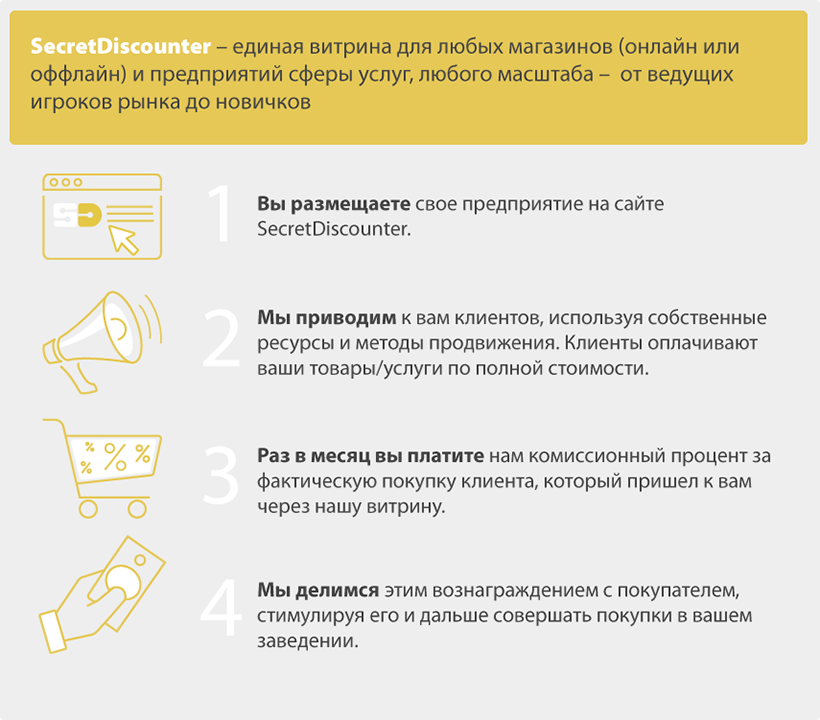 Стандартный кэшбэк-сервис обычно включает в себя cashback с интернет-магазинов и промокоды к интернет-магазинам. Какие-то сервисы также ведут блог об экономии, и еще меньше позволяют отследить посылку любой почтовой службы прямо на своем сайте. Сикрет Дискаунтер пошел еще дальше и разместил на своем сайте раздел, предлагая бесплатно подключить к себе любой магазин, ресторан, салон красоты, стоматологию, СТО и, фактически, стать первым в СНГ, кто возвращает кэшбэк и в оффлайне.