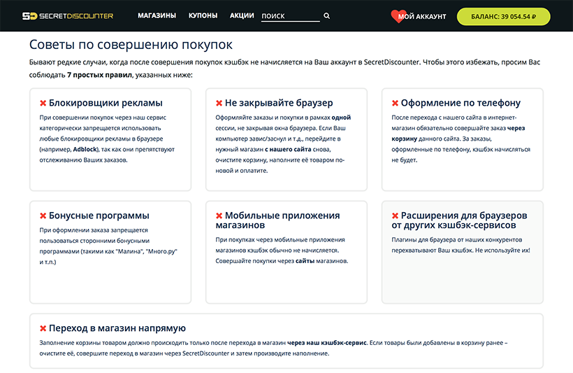 Конечно, эксперты Myfin.by изучили сервис немного глубже и даем вам один совет: для того, чтобы все ваши покупки через кэшбэк отслеживались корректно, необходимо отключать на время покупки блокировщики рекламы типа AdBlock, потому что именно они препятствуют отслеживанию вашего кэшбэка. Также в вашем браузере должно быть разрешено использование файлов cookies.