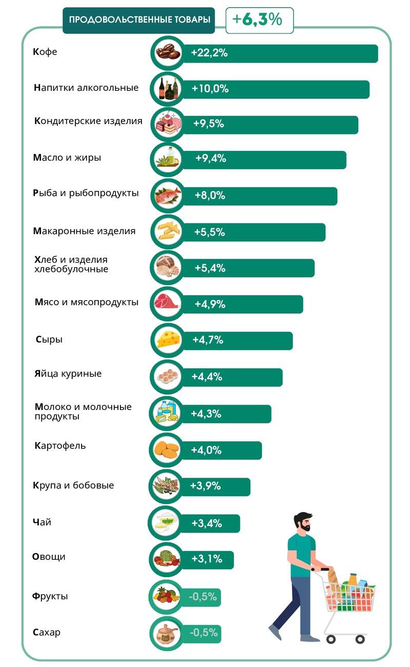 В разрезе отдельных групп продовольственных товаров больше всего подорожали кофе (+22,2%) и алкогольные напитки (+10%).
