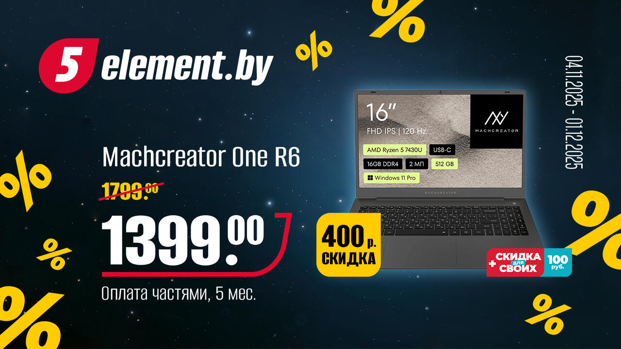 Ноутбук Machcreator JJ00G000HRU One R6 – для создания своих творческих и рабочих вселенных. Мощная начинка для воплощения самых смелых проектов и комфортного отдыха. Ваша выгода: 400 рублей. И главное: для участников программы «Для своих» – дополнительная эксклюзивная скидка в 100 рублей!