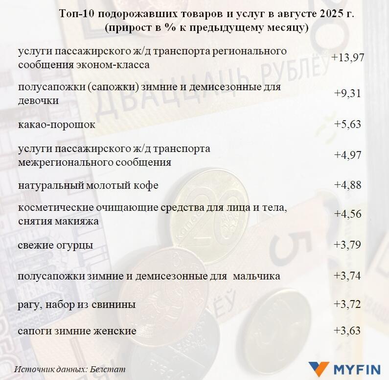 Если говорить о конкретных товарах и услугах, то в августе 2025 года по отношению к предыдущему месяцу наибольший прирост цен показали услуги пассажирского ж/д транспорта регионального сообщения эконом-класса, полусапожки (сапожки) зимние и демисезонные для девочки, какао-порошок.