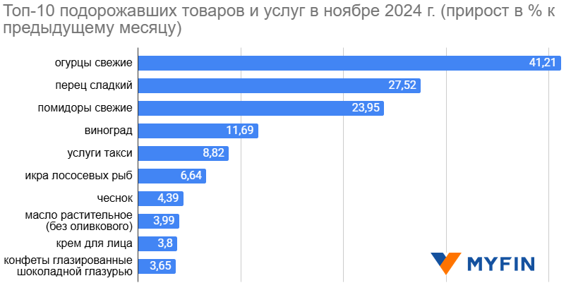 Если говорить о конкретных товарах и услугах, то в ноябре 2024 года по отношению к предыдущему месяцу заметный прирост цен показали свежие огурцы и томаты, сладкий перец, виноград.