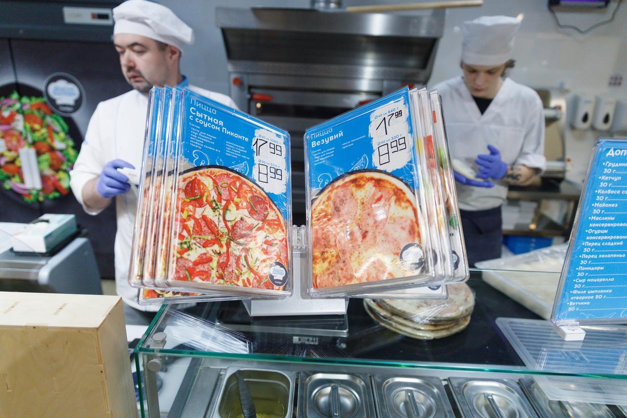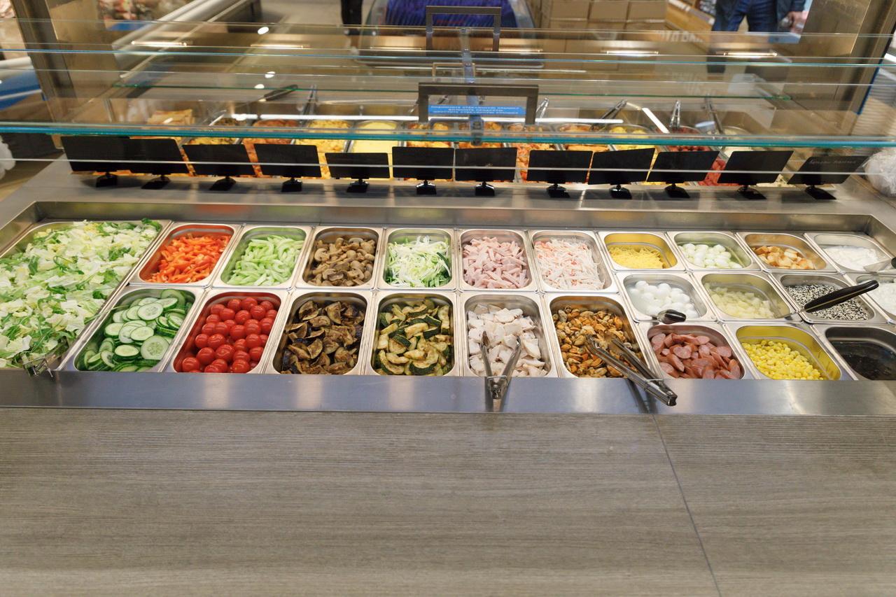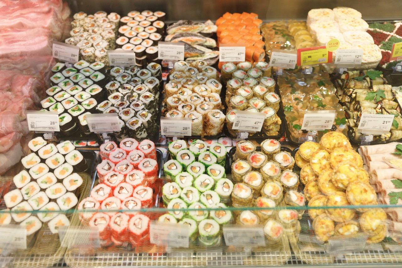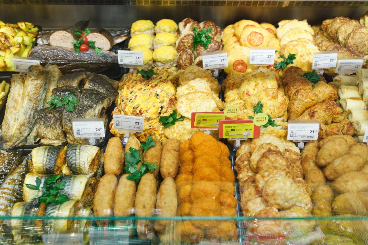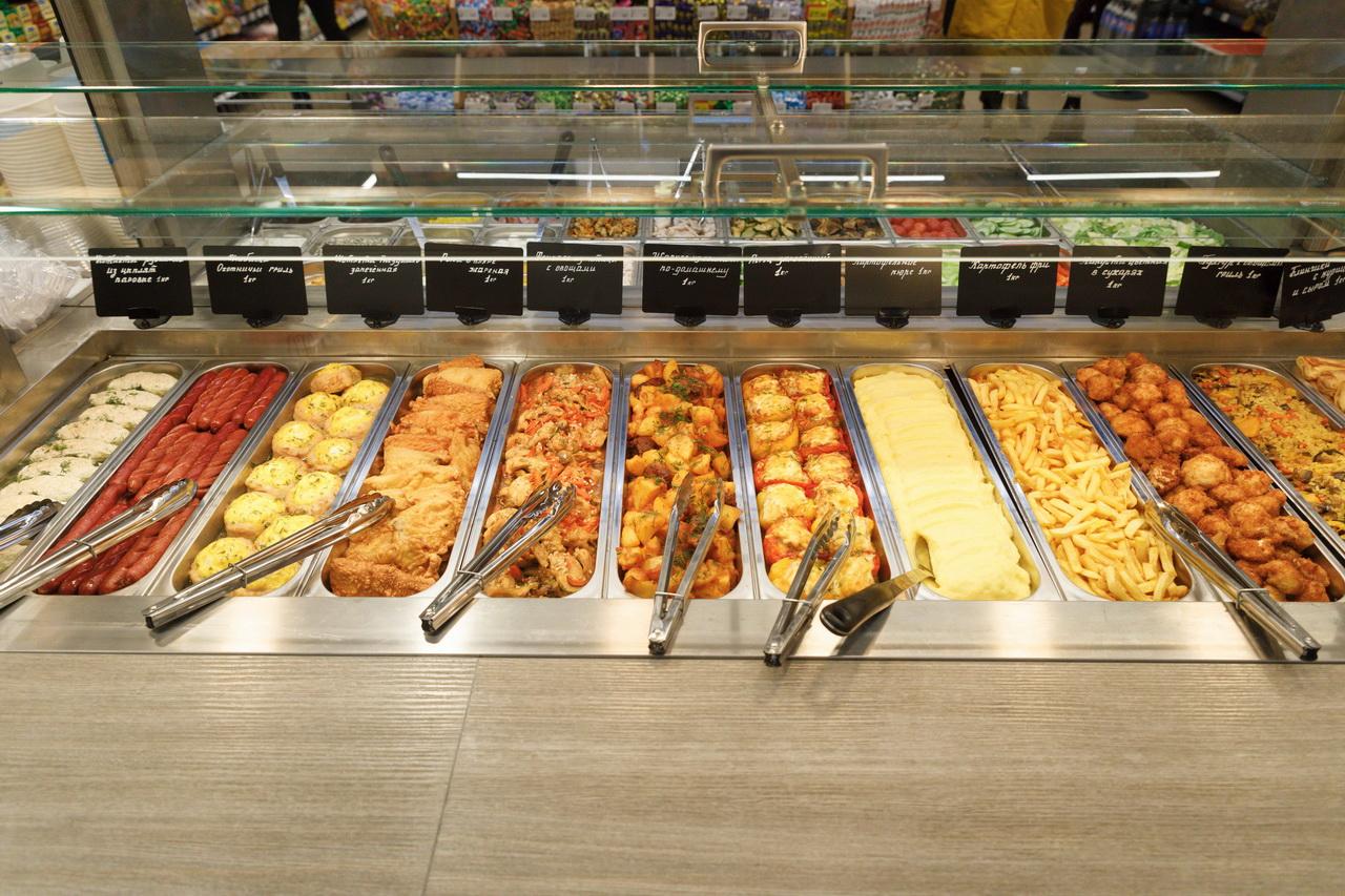 Большой фокус сделан на собственной кулинарии: мясных и рыбных полуфабрикатах, копченостях и роллах. На месте готовят разные виды пиццы, фокаччу, врапы и хачапури. Собрать быстрый обед или ужин можно в гастро-баре или салат-баре. Так, паровые котлетки с овощами и салат с сыром, моцареллой и помидорами обойдутся менее чем в 10 рублей.